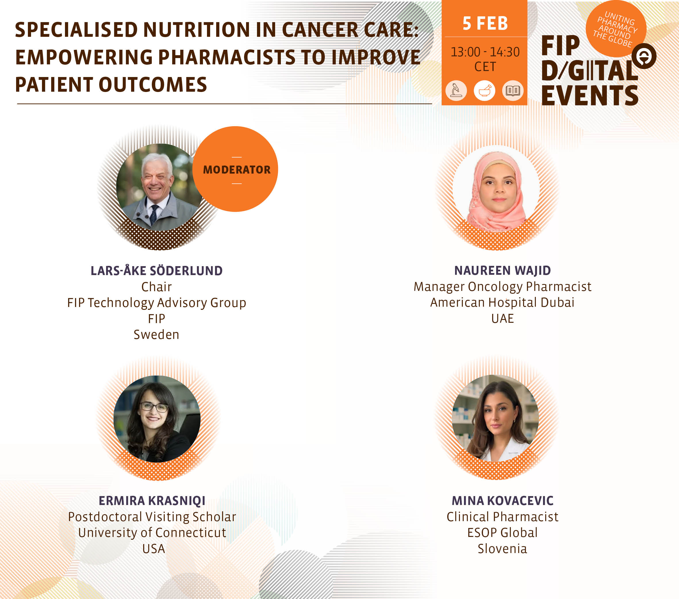 This webinar explored the role of specialised nutrition in cancer care, with a focus on high-protein oral nutritional supplements and the contribution of pharmacists in various care settings. This event marked the launch of a new FIP CPD Bite designed to strengthen pharmacists’ knowledge, skills and confidence in supporting specialised nutrition and the appropriate use of high-protein oral nutritional supplements in cancer care.