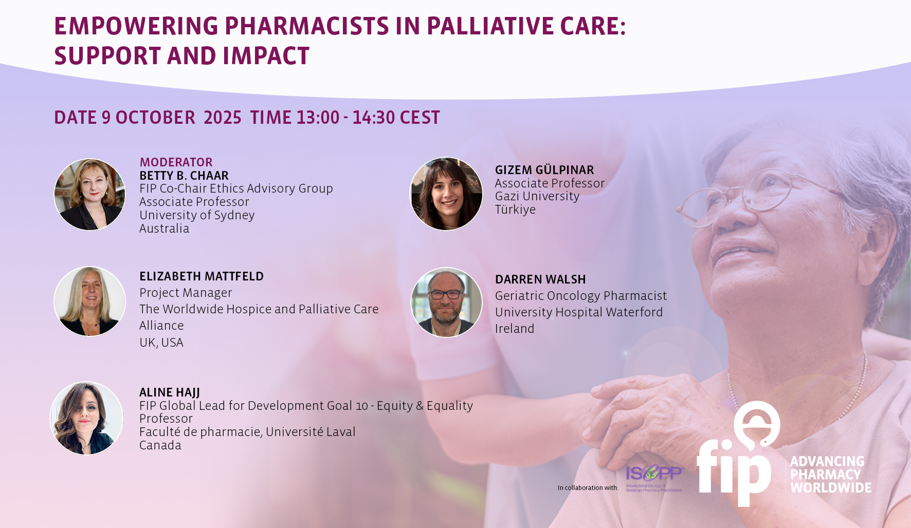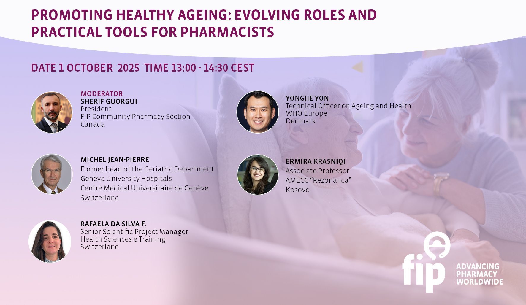 1 October 2025With the world’s population ageing rapidly, pharmacists had a growing role in promoting health, independence and quality of life for older persons. This digital event marked the International Day of Older Persons and brought together global experts to explore strategies from the World Health Organization, updated definitions and preventive approaches to healthy ageing, and the evolving role of community pharmacists.