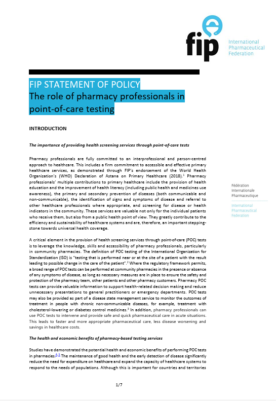 1 September 2022This FIP Statement of Policy is intended to support governments and policymakers, FIP member organisations, pharmacy academic institutions and individual pharmacy professionals wishing to promote the provision of point-of-care screening and testing services in pharmacies.